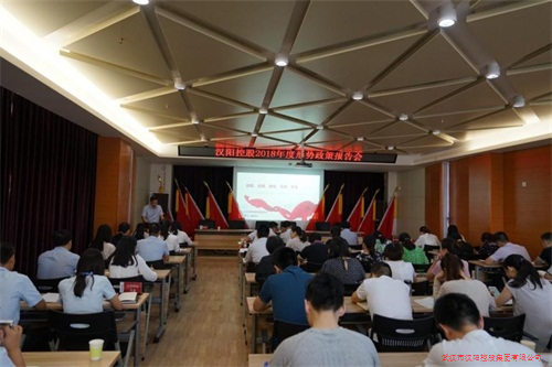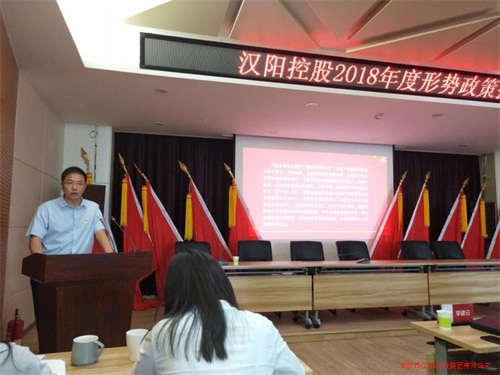 2018年7月27日上午,漢陽控股在金龍公館寫字樓11樓大會議室召開2018年度形勢政策報告會,由漢陽控股黨委書記、董事長喻天勝以“創(chuàng)新、協(xié)調(diào)、綠色、開放、共享——關(guān)于推進馬克思主義中國化時代化大眾化重要思想”為主題,向全體黨員做形勢政策報告。
