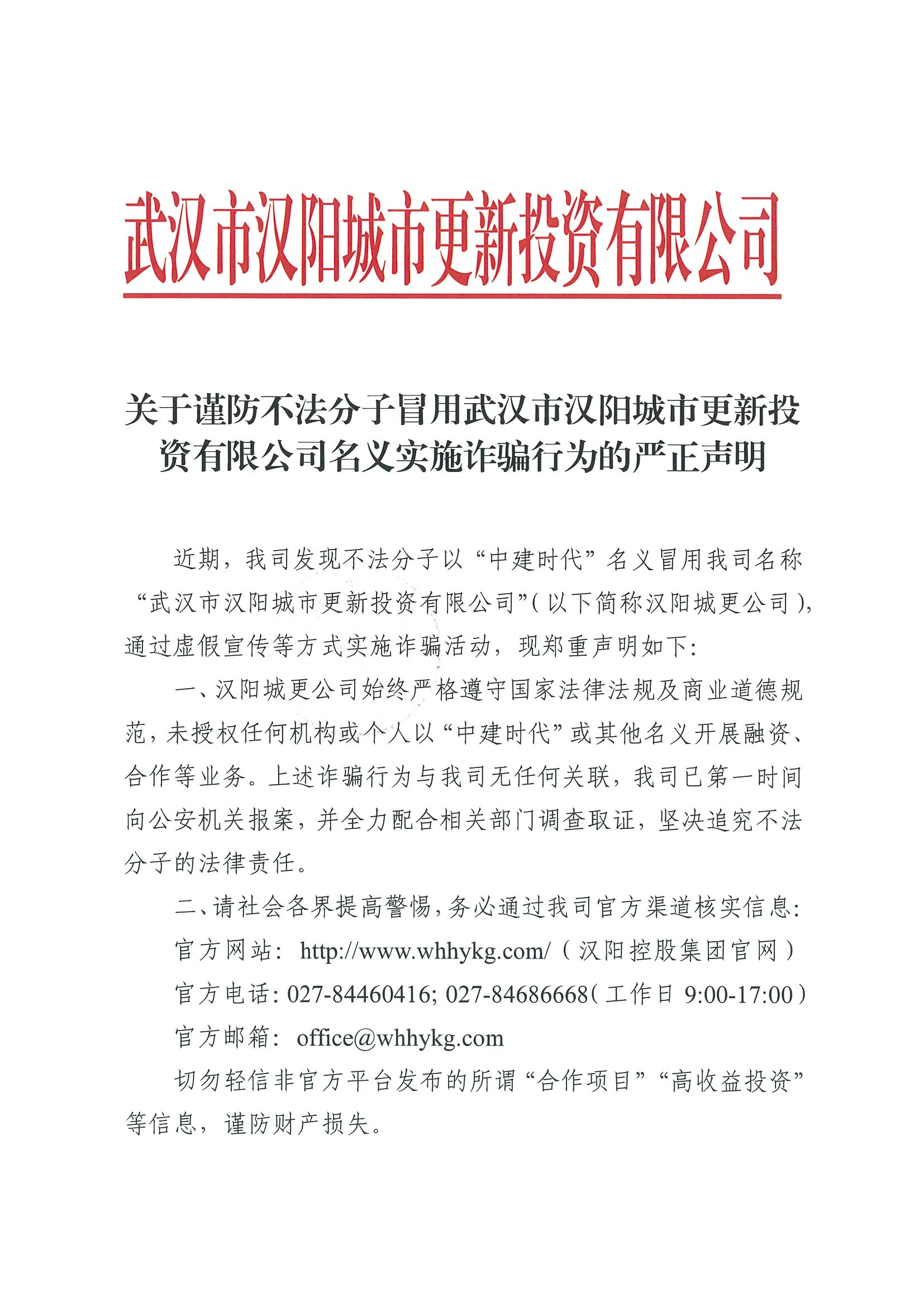 關(guān)于謹(jǐn)防不法分子冒用武漢市漢陽城市更新投資有限公司名義實(shí)施詐騙行為的嚴(yán)正聲明