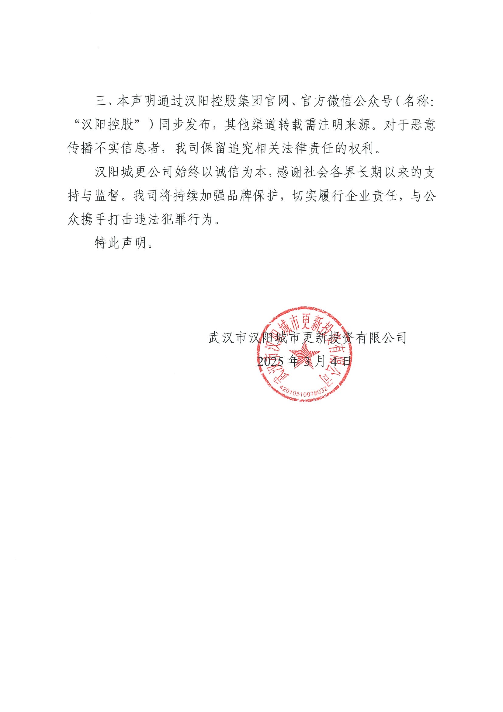 三、本聲明通過漢陽控股集團(tuán)官網(wǎng)、官方微信公眾號(hào)(名稱:“漢陽控股”)同步發(fā)布,其他渠道轉(zhuǎn)載需注明來源。對(duì)于惡意傳播不實(shí)信息者,我司保留追究相關(guān)法律責(zé)任的權(quán)利。